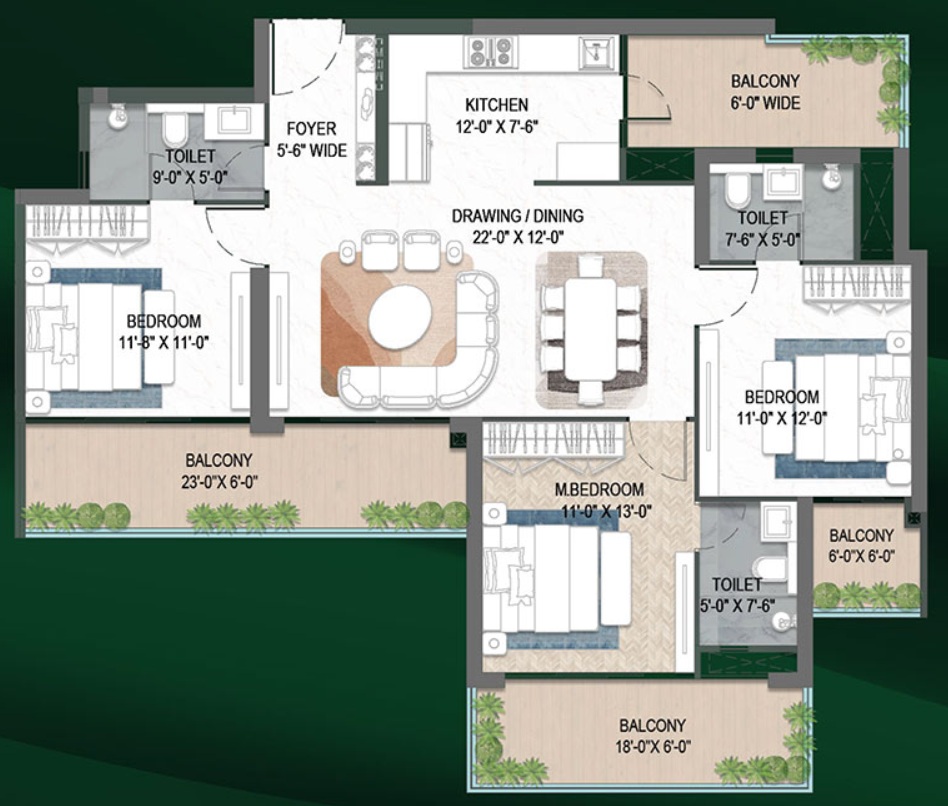 The development features premium 3 BHK + Utility and select 4 BHK + Utility homes with expansive layouts and modern interiors. Each residence is crafted with high-quality finishes, wide balconies, and functional spaces that blend comfort with elegance.